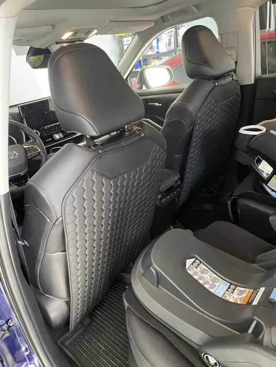 Our seat back protector features a five-layer construction with upgraded premium eco-leather on top, two layers of high-density foam, 600D Oxford, and an anti-slip rubber backing.