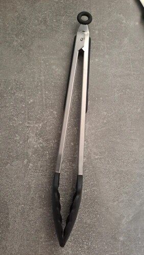 Long pair of tongs nice quality. Packaged well nice delivery. Not as sturdy as oxo but still good.