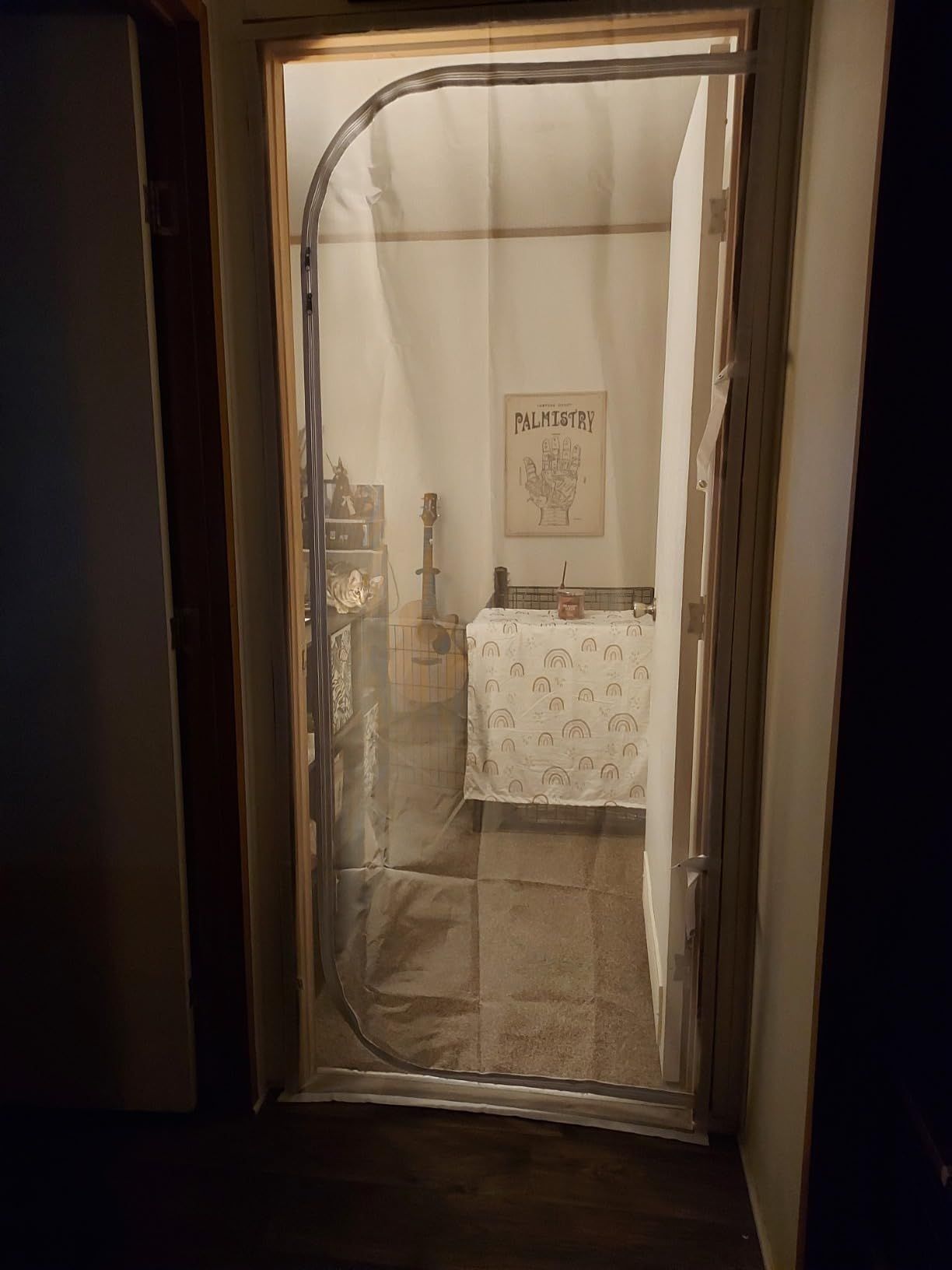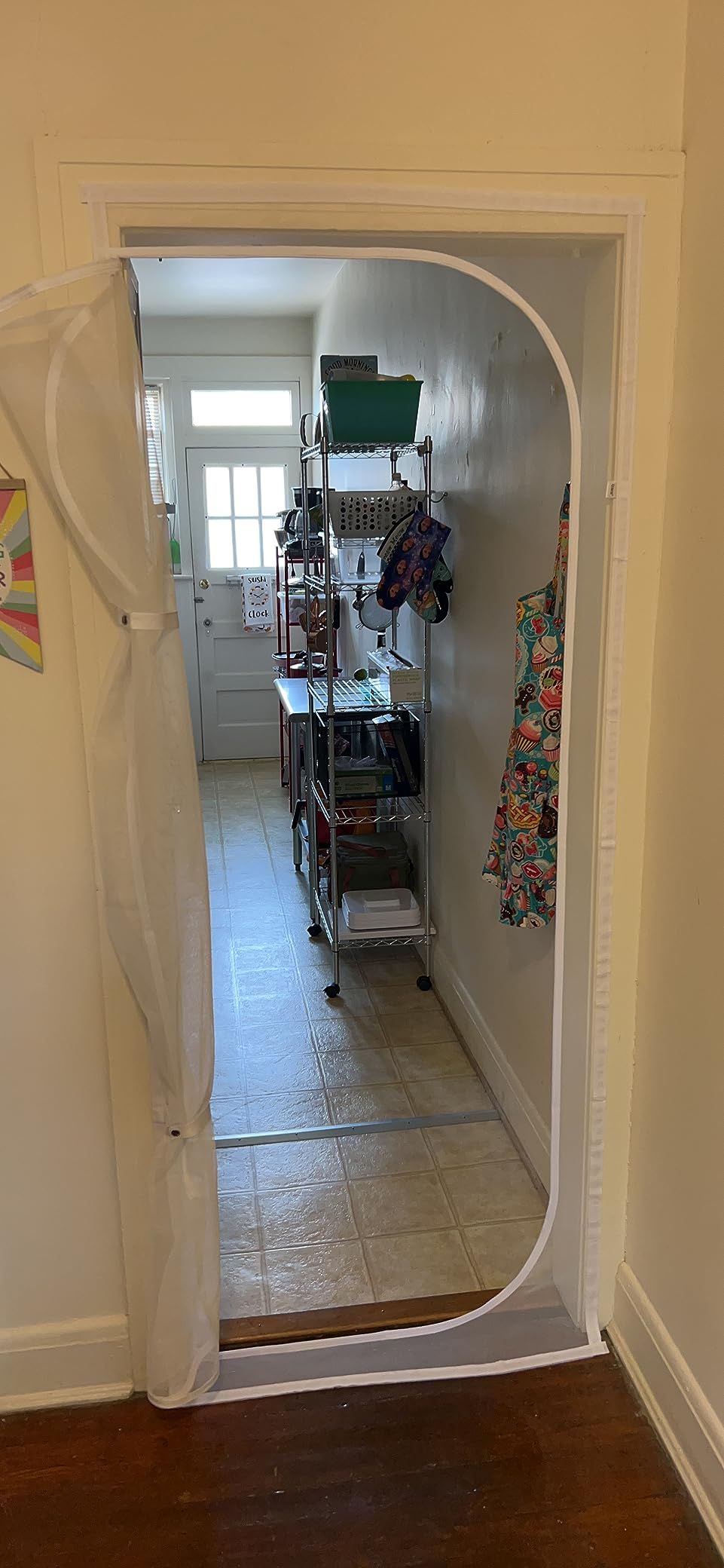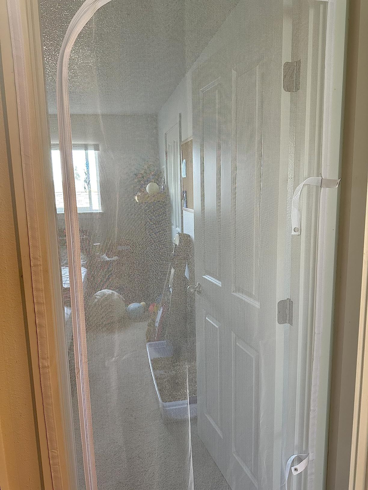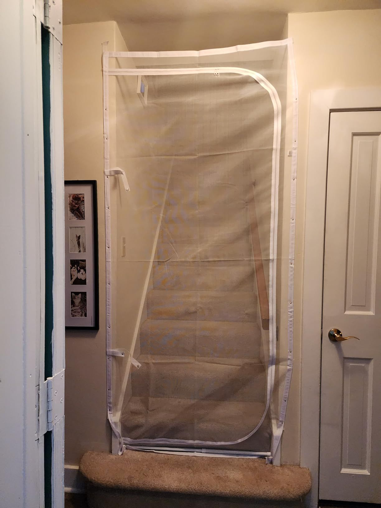 I got this for my doorway while recovering from surgery. It allows cool air into my room while giving me privacy. The snap closure straps are useful, but the velcro adhesive can damage wood frames. Overall, a good purchase for renters.