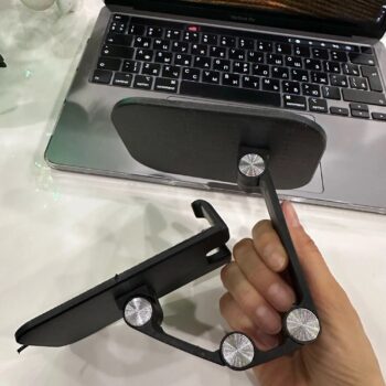 The stand's four-point adjustment and metal construction are solid. It accommodates even large, wallet-like phone cases, and adding weight to the base enhances its stability on uneven surfaces