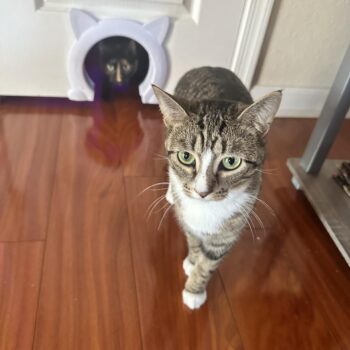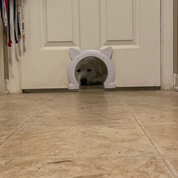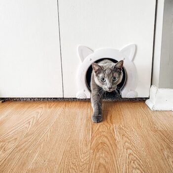 This pet door is a brilliant idea, especially in homes with multiple animals. It effectively keeps other pets away from the cat's food and litter box.